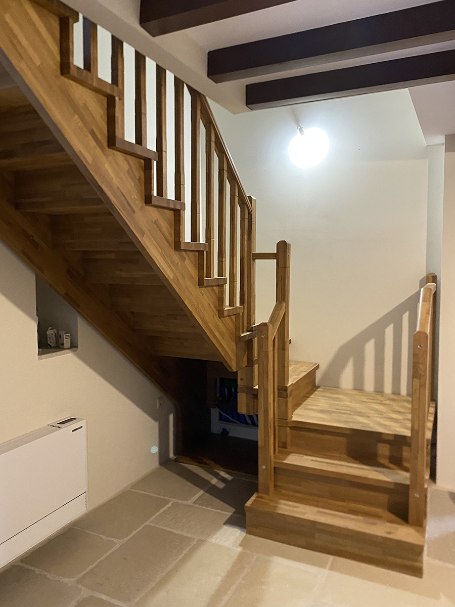 Η ξύλινη σκάλα αποτελεί βασικό στοιχείο σύνδεσης των επιπέδων, με στιβαρή κατασκευή και διαχρονικό σχεδιασμό. Οι εσωτερικές πόρτες και τα ξύλινα κουφώματα ενσωματώνονται αρμονικά στο σύνολο, αναδεικνύοντας την ποιότητα της ξυλείας και τη λεπτομέρεια της χειροποίητης δουλειάς.